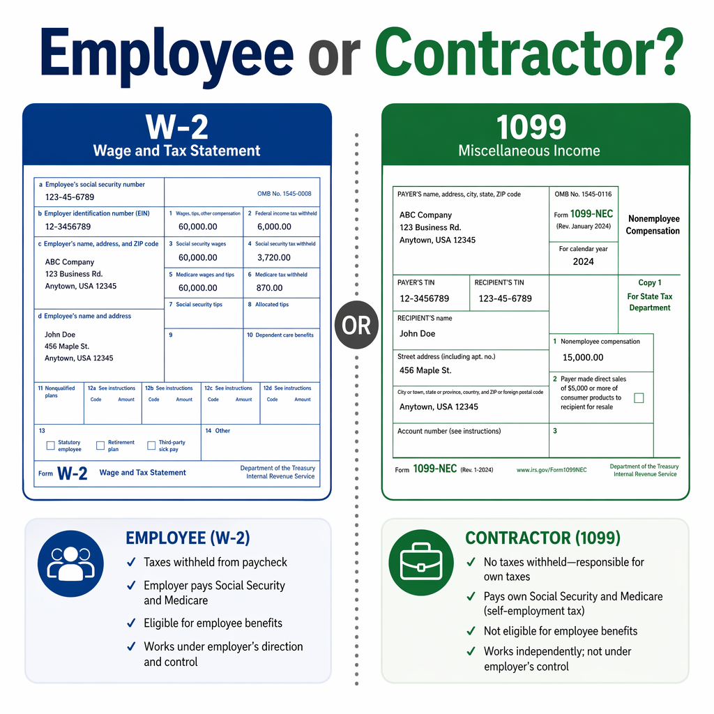 Not always. And if the IRS or your state labor board disagrees with how you’ve classified that worker, the consequences can be significant: back taxes, penalties, and in some cases, personal liability.